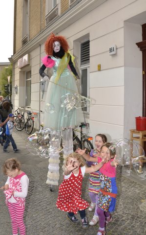 Freunden und Kolleginnen realisiere ich Performance-Auftritte und trete auch solo als Stelzenläuferin auf.